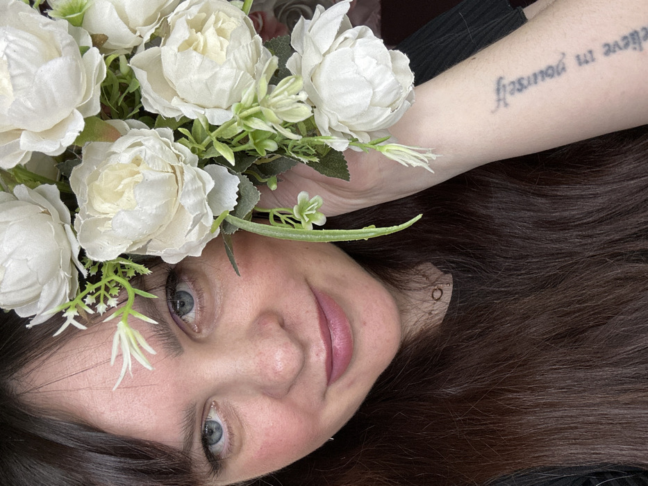 A female individual is depicted in a close-up, front-facing portrait. She has long, dark brown hair with bangs partially visible on her forehead. Her complexion is fair, with scattered freckles visible on her nose and cheeks. She has blue eyes, which are enhanced with eyeliner and mascara, and dark, defined eyebrows. Her lips are colored with a pink lipstick, and she exhibits a subtle, closed-mouth smile while looking directly at the camera. She is wearing a dark, possibly black, garment, with a ribbed texture visible on her right arm. A delicate necklace with a small circular pendant is visible on her neck. On the inner aspect of her left forearm, a tattoo in a script font reads "believe in yourself". The individual is holding a cluster of artificial white or cream-colored flowers, possibly peonies or roses, interspersed with artificial green foliage. These flowers are positioned on the right side of the frame, partially obscuring the right side of her face and head. Her left hand is visible supporting the floral arrangement. The background is out of focus and indistinct, appearing dark and providing no discernible environmental or geographical context. The image offers no visual indicators to determine a specific location, such as Noviy, Russia. The scene appears to be an interior setting or a studio portrait.