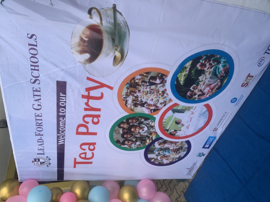white banner with the text "Lead-Forte Gate Schools" and "Welcome to our Tea Party" in black and red lettering