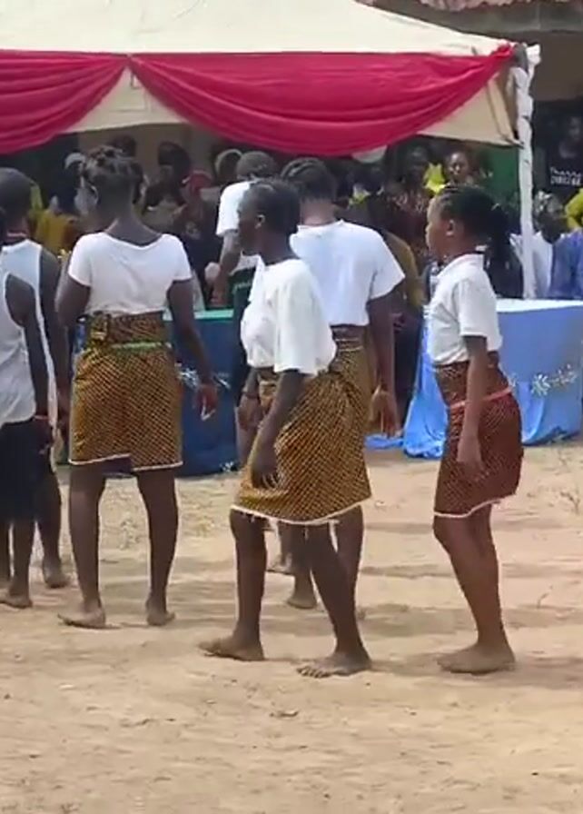 A group of young, dark-skinned people dance in a line in front of an audience at an outdoor event. The dancers are primarily girls, who wear white t-shirts and patterned brown and gold skirts; a few boys are present, wearing t-shirts and shorts. They move barefoot on a sandy ground. Behind them, a crowd watches from beneath a metal-roofed structure. A tent with red and gold draping is also visible. People in the crowd are seen in yellow and blue clothing.