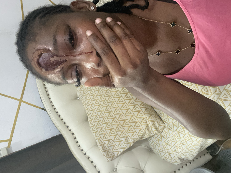 The image presents a close-up, eye-level indoor shot of a young adult female, dark-skinned, exhibiting signs of distress. Her right hand is raised, covering her mouth and lower nose, with her eyes appearing moist. A prominent, roughly circular wound is visible on her forehead, situated superior to her left eyebrow. The wound displays raised edges and contains dark reddish-brown material within its cavity. A streak of dark red fluid, consistent with blood, emanates from the wound and flows vertically down the bridge of her nose. She wears a pink tank top and a long, gold-colored chain necklace adorned with multiple black four-leaf clover-shaped pendants. A small, clear stud earring is visible in her right ear. Her hair is dark and styled in small braids or twists. The background reveals a padded, tufted headboard or piece of furniture, upholstered in a light cream or off-white material, positioned to her left. A pillow with a light-colored cover featuring a repeating geometric pattern of gold triangles rests against the headboard. Behind the furniture, a wall is visible with thin gold linear decorations forming intersecting angles. The scene depicts an indoor setting, likely a private residence, in the city of Accra, Ghana.