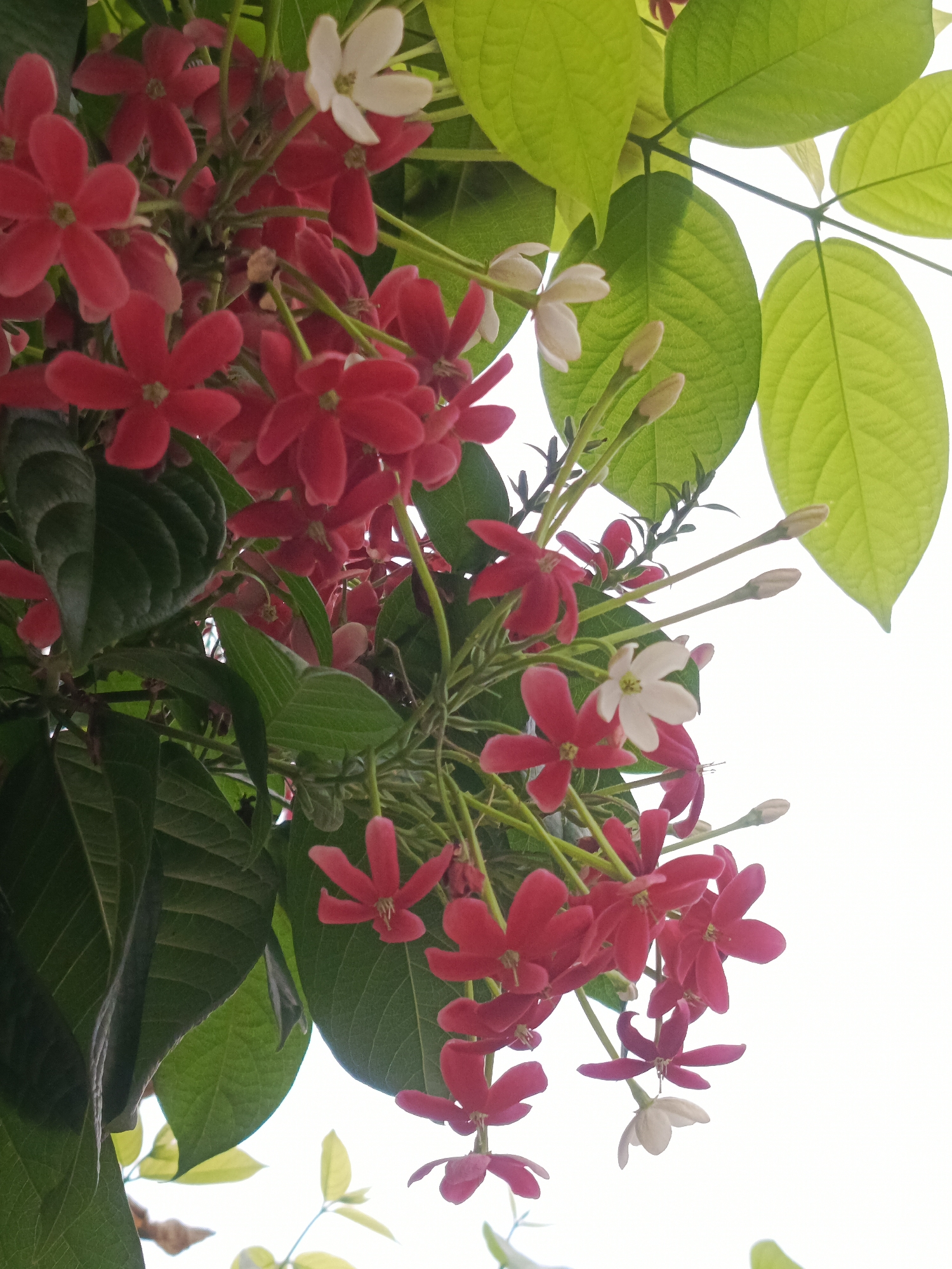 - "The image depicts a cluster of Rangoon creeper flowers and leaves, with red and white blossoms visible among the green foliage" by FM-WXIIo1, licensed under CC BY 4.0