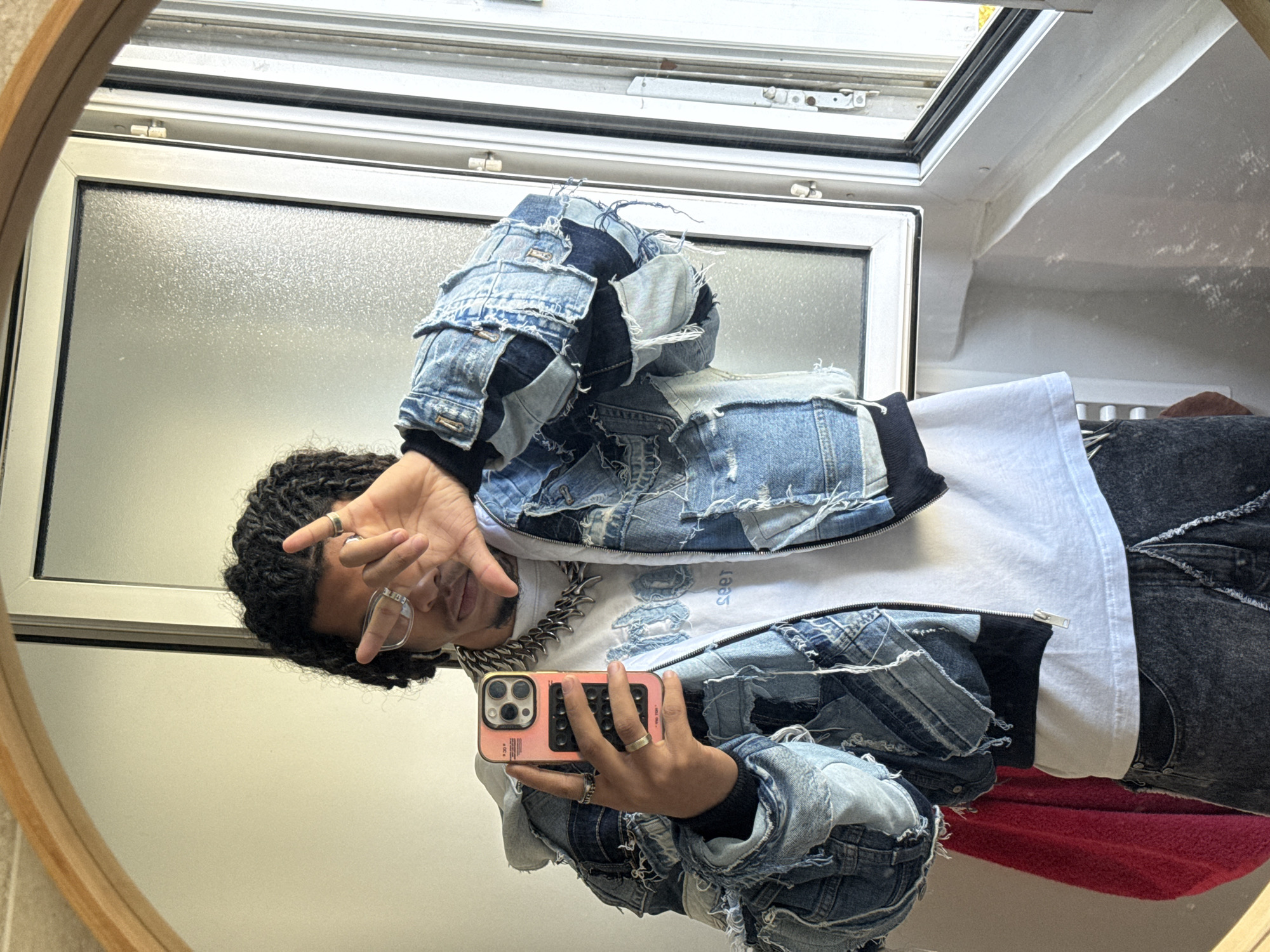 An individual is captured in a mirror selfie taken indoors in Massy, France. The subject is a male with dark dreadlocks or braided hair, wearing clear-framed glasses. His left hand is raised, partially obscuring his face, with two fingers forming a V-shape. He is holding a rose gold/pink iPhone with a black textured case in his right hand to take the photo. The subject is dressed in a heavily patched and distressed denim jacket constructed from various shades of blue denim fabric scraps, featuring frayed edges and a black zippered front with a black ribbed collar and cuffs. Underneath, he wears a white t-shirt with a light blue graphic that includes the word "seen." A large, chunky silver-colored chain necklace with spiked links is visible around his neck. His lower body is partially visible, showing dark grey or black acid-wash jeans. Multiple silver-toned rings adorn both hands. The background includes a light-colored wall to the left and a white-framed window system to the right. The window consists of multiple panes, one appearing frosted or textured, and another clear, revealing bright exterior light. Visible hinges suggest part of the window may be open. Below the mirror, to the left of the subject, a folded red textile is present. The mirror itself has a light wooden frame and a rounded shape, reflecting the immediate surroundings.