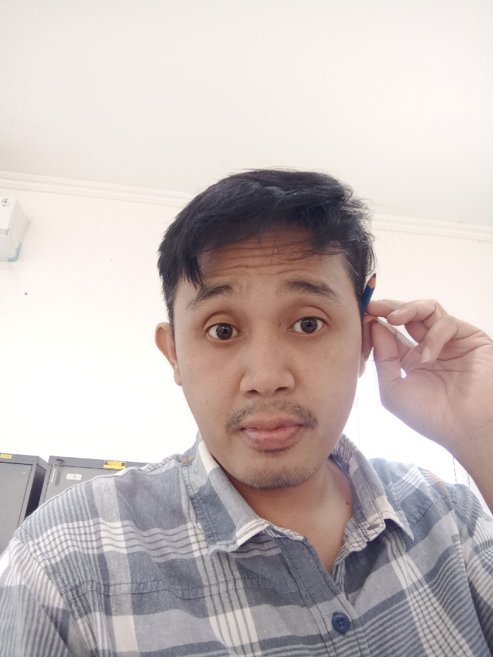 A man's selfie. He has dark hair, brown eyes, and a mustache. He is wearing a blue and gray plaid shirt. He is holding a blue pencil near his right ear. The background consists of a white ceiling, a white wall with an air conditioning unit, and gray filing cabinets. The lighting is bright and even.