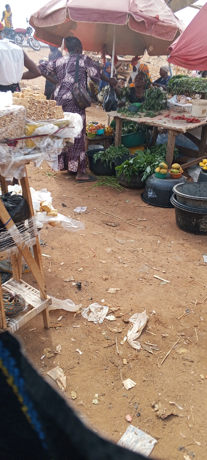 An outdoor market scene in Keffi, Nigeria, depicts multiple individuals and merchandise under partial shade
