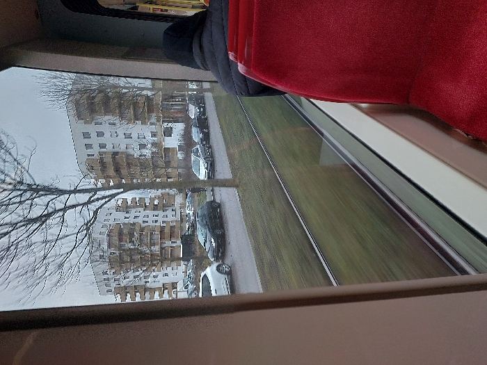 The image depicts an urban scene in Ostwald, France, viewed from within a moving vehicle under a light grey, overcast sky. In the immediate foreground on the right, the back of an individual wearing a black hooded jacket is visible, seated in a red upholstered seat. A window occupies the central and left portions of the frame, showing a motion-blurred green strip of ground immediately outside, which is traversed by two parallel lines consistent with tram tracks. Beyond the green strip, a paved area holds a line of parked vehicles, all facing right. These include a white hatchback, a black hatchback, a silver hatchback, and several other dark-colored cars. Sparse, bare deciduous trees with thin branches are interspersed along this roadside. The background is dominated by two large, white multi-story residential buildings. These buildings feature numerous balconies with light-colored or wooden railings arranged in structured patterns across their facades.