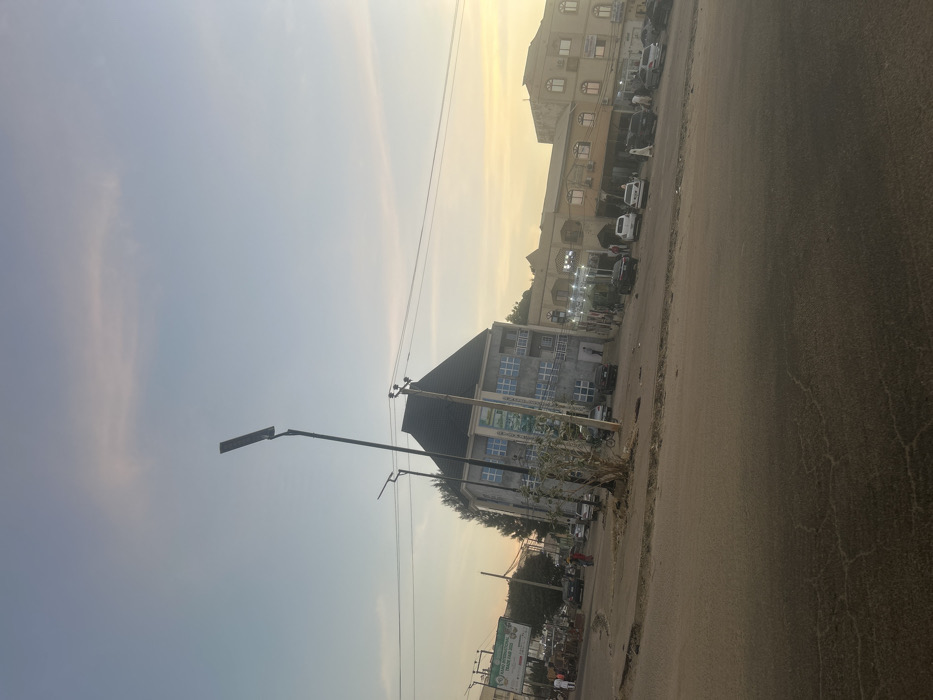 A street scene under a pale sky reveals buildings of varying styles. One structure has a steeply pitched roof, while another is a multistory edifice with numerous windows. Streetlights line the road, and parked cars are visible in front of the buildings. Cracks mar the road surface. A sign is partially visible at the bottom of the frame. The lighting suggests it is either dawn or dusk.