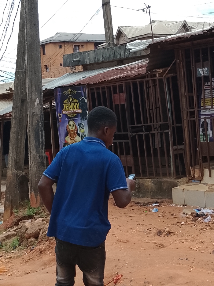 This image depicts an outdoor urban scene in Awada, Nigeria. In the immediate foreground, a male subject, viewed from behind and angled slightly right, wears a blue polo shirt with white trim and dark grey jeans. He is holding a light-colored smartphone in his right hand, appearing to interact with it, and a white object, possibly a cigarette, is visible at his mouth. The ground beneath the subject is unpaved reddish-brown dirt, uneven, and littered with various pieces of refuse, including plastic bags, wrappers, and small debris. To the left, a tall, weathered concrete utility pole stands, from which numerous black electrical wires extend upwards and across the scene. In the mid-ground, a series of single-story structures, likely commercial stalls or shops, are visible. These structures feature rusty, corrugated metal roofs and metal bar security grates. A prominent vertical banner advertising "JENNY BEAUTY WORLD SALON" is affixed to one of these structures, displaying an illustration of a woman wearing traditional jewelry and a braided hairstyle. Another partially visible poster is located to the right. A low concrete foundation or curb runs along the base of these structures. In the background, a multi-story building with a light brown facade and a dark grey hip roof is visible, featuring several small, rectangular windows. Portions of other buildings with grey gabled roofs are also discernible. The sky above is bright and lightly overcast.