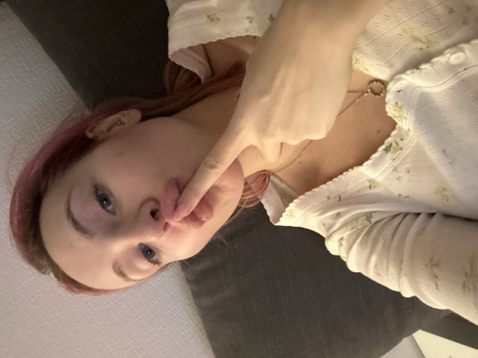 A young woman with pink hair and blue eyes poses close to the camera, her finger pressed against her lips in a playful gesture. She wears a floral-patterned white top and a delicate necklace with a circular pendant. The background consists of a neutral-toned wall and a dark gray pillow or cushion, suggesting she's lying down. The image is lit softly, creating a casual and intimate atmosphere.
