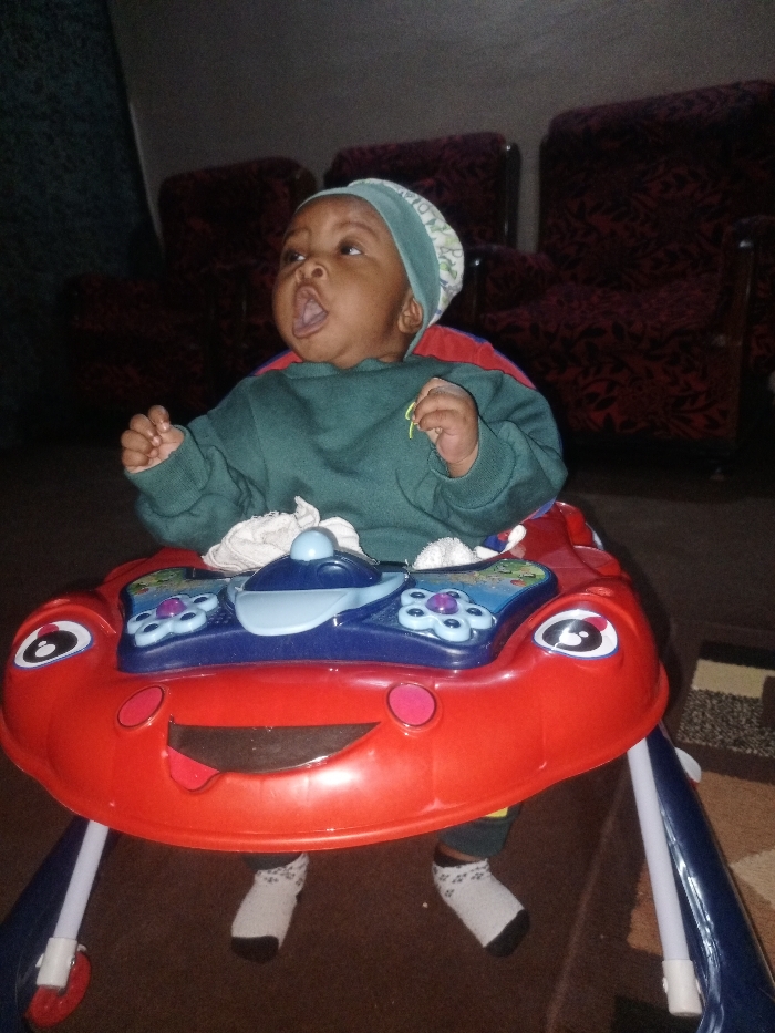 - "A baby wearing a green sweater and patterned hat sits in a red and blue baby walker" by FM-HxAtG3, licensed under CC BY 4.0