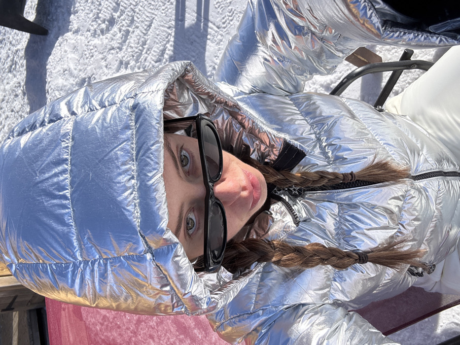 A high-angle selfie depicts a person, likely female, situated outdoors in a snowy environment within Courchevel, France, under direct sunlight. The individual wears a metallic silver, highly reflective, hooded puffer jacket with a visible front zipper and an apparent black inner collar. Two brown braided pigtails extend from beneath the hood. Dark, rectangular sunglasses are positioned on the face, partially revealing light-colored eyes (green/hazel) looking directly at the camera. The lips are slightly pursed. White ski pants or the lower portion of a ski suit are visible beneath the jacket. The person is seated on an outdoor chair; a reddish-pink fabric surface is visible to the left, and a dark metal chair frame is visible to the right. The background consists of sunlit snow and indistinct dark shadows, with a light-colored wooden structure partially visible in the upper left.