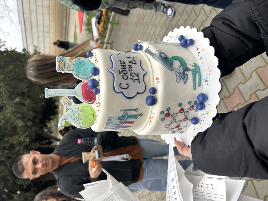 A two-tiered white cake, decorated with a science theme, is held in the foreground by two hands wearing a black puffer jacket. The cake, resting on a white scalloped board, features various colorful edible cutouts: the top tier displays three laboratory flasks with green, red, and blue liquids, along with blue spherical candies and sprinkles. A white, blue-rimmed plaque on this tier reads "С обич 12ти В!" in black Cyrillic script. The bottom tier is adorned with a test tube rack holding colorful test tubes, a blue-green microscope, and a molecular structure diagram, accompanied by additional blue spherical candies and sprinkles. In the mid-ground, a young male with short dark hair, wearing a dark jacket over a brown shirt, stands to the left of the cake, looking towards the right. He holds a light-colored paper cup and a small pink plastic bottle in his left hand and white papers in his right. A female individual with long brown hair, wearing a dark jacket, is partially visible from behind to the right of the cake. The background consists of an outdoor paved area with light-colored interlocking brick pavers. Leafless trees are present, suggesting a colder season. A light-colored building with dark windows, a red surface, and yellow outdoor furniture are visible in the distance. Several blurred individuals are scattered in the background. The scene depicts an outdoor gathering, consistent with a school or public area in Stara Zagora, Bulgaria, indicated by the Bulgarian text on the cake.
