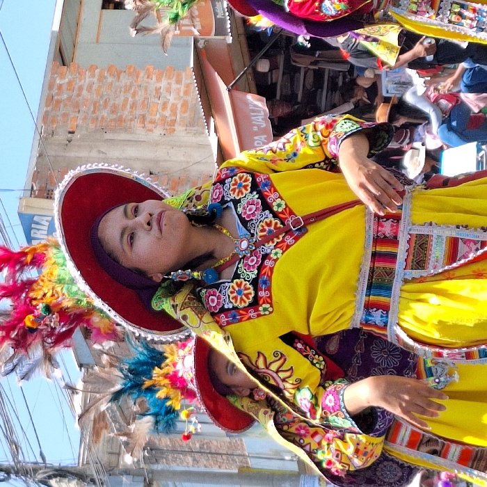 A woman in a vibrant yellow dress with colorful floral embroidery stands out. She sports a wide-brimmed red hat adorned with feathers. Buildings and overhead wires form the backdrop. The scene seems to capture a cultural celebration or festival, filled with vivid colors and intricate traditional attire. Other people are partially visible in the background, further hinting at a public event.