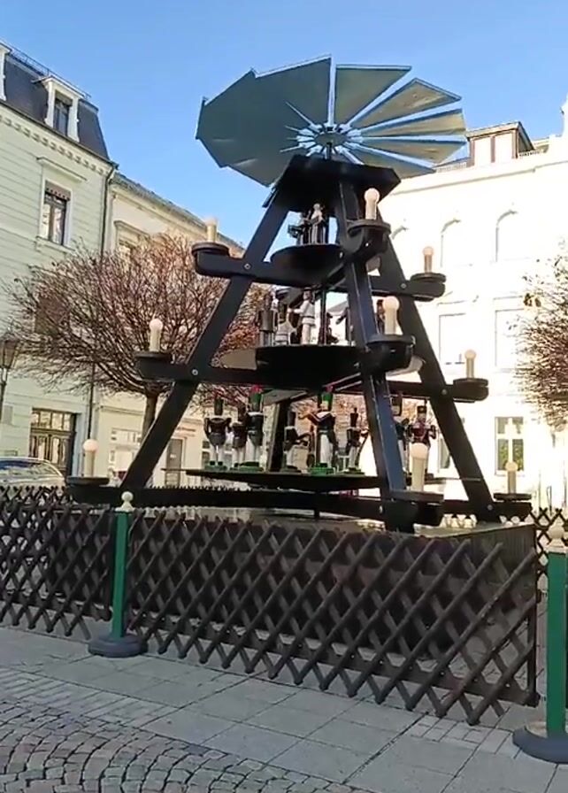 multi-tiered wooden Christmas pyramid standing outdoors on a cobblestone surface. The pyramid is enclosed by a dark, woven fence with decorative posts. The structure is made of dark wood, with several tiers decorated with small figurines. Each tier is outlined with what appear to be light bulbs. At the top of the pyramid is a large fan-like structure, presumably designed to spin. Buildings in a classical architectural style are visible in the background under a clear, blue sky. There's also a tree without leaves visible.