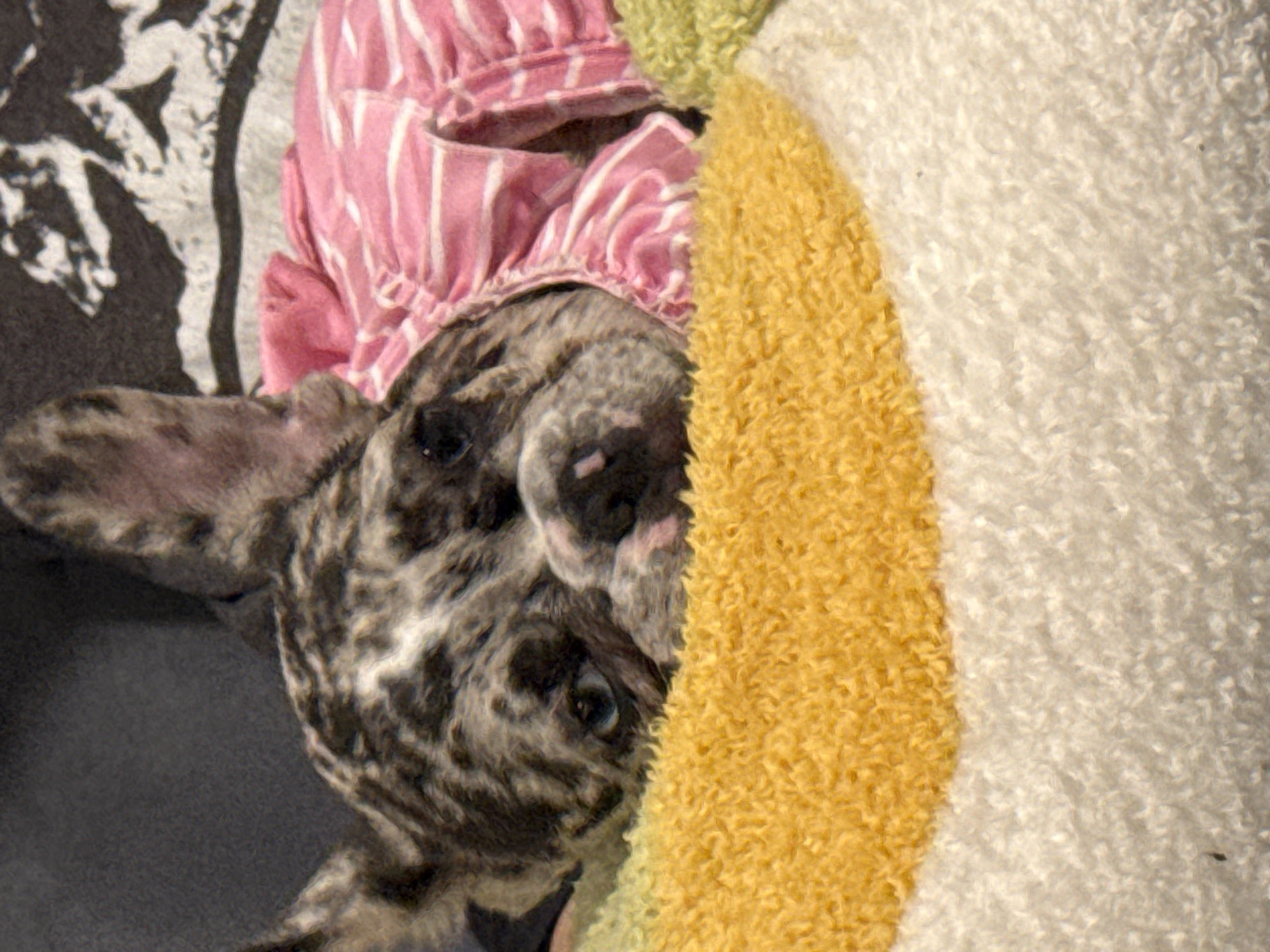 A single French Bulldog puppy is depicted lying down, positioned centrally within the frame. The puppy exhibits a merle coat pattern, characterized by patches of grey, black, and brown fur, and possesses distinct blue irises, with the left eye clearly visible. It is dressed in a pink garment featuring white horizontal stripes and ruffled embellishments around the neckline. The puppy's head rests on a plush, textured surface, primarily bright yellow in the foreground, transitioning to white further down, with a segment of light green visible to the right. The background consists of a dark, textured material, likely upholstery, with a larger dark fabric behind it displaying a prominent light-colored, stylized graphic or pattern. No human subjects are present. The scene is located indoors in Austin, United States of America.