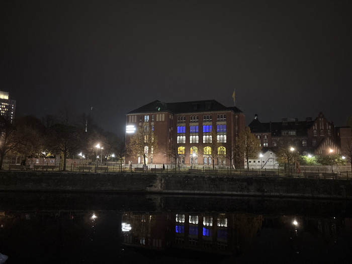 The image displays an urban night scene along the Spree River in Berlin, Germany, facing the Altes Stadthaus and the Märkisches Museum. The sky is dark and clear. In the midground, the prominent multi-story, red-brick Altes Stadthaus features numerous windows on its facade. The windows on the upper floors are illuminated with blue light, while those on the lower floors glow yellow, forming a large-scale representation of the Ukrainian flag. A yellow flag is also visible atop the building's dark roof. A rectangular white sign with dark text is affixed to the upper left section of the Altes Stadthaus. To the right of this building, a smaller, light-colored building with a dark sloped roof is present, followed by the darker, multi-story brick structure of the Märkisches Museum, characterized by gothic architectural details and internally illuminated windows. On the far left, a tall, modern building with internal lighting is partially visible behind a stand of trees. The dark, placid water of the Spree River occupies the foreground, reflecting the illuminated windows of the buildings, particularly the blue and yellow lights of the Altes Stadthaus, and streetlights. A stone embankment separates the river from a paved pathway on the far bank. Numerous deciduous trees with minimal foliage line this pathway. Several streetlights with bright yellow-white illumination are spaced along the path, casting light onto the ground and trees. Multiple empty park benches are positioned along the path. A dark railing or fence runs parallel behind the path and benches. One dark-clad individual is walking leftward on the path near the benches on the far left side. A second, fainter dark figure is visible further right along the path.