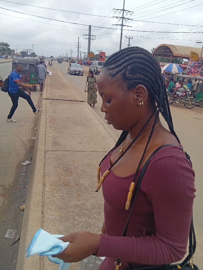 The scene depicts an urban street in Ura Nta Umuarandu, Nigeria, under an overcast sky. In the immediate foreground, a young Black female is positioned on a concrete median, viewed from the right. She wears a long-sleeved, ribbed, dark reddish-purple dress, small gold hoop earrings, and a gold pendant on a chain. Her hair is styled in cornrows with individual braids extending, some adorned with light brown tubular beads. She holds a light blue cloth in her right hand and directs her gaze downwards. Behind her, the concrete median separates her from a paved multi-lane road. On the left side of the median, a young Black male in a blue t-shirt, black pants, and white sneakers is in the process of stepping onto or off the concrete barrier. He carries a black backpack. Adjacent to him is a green and black motorized trishaw, and another Black male in a light-colored top stands nearby. Further down the road in the center, a Black female in a long patterned dress walks on the asphalt. Vehicular traffic includes a silver sedan and multiple motorcycles/scooters observed further in the distance. On the far right, a market area is visible, characterized by an arched metal roof, various stalls, and colorful umbrellas. Numerous utility poles with overhead power lines extend across the background. Debris, including paper and plastic, is visible in the street gutter immediately adjacent to the concrete median.