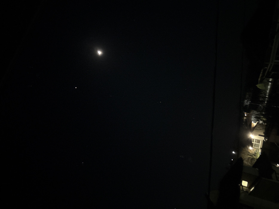 The image displays a nighttime scene in Stefan Karadja, Bulgaria. The upper two-thirds of the frame consist of a dark sky, featuring a bright crescent moon in the upper right quadrant and numerous scattered stars. A dark, linear cable traverses horizontally across the mid-ground, separating the sky from the terrestrial elements. In the lower left, the dark silhouette of a building roof is visible. To the right, residential structures are partially illuminated by artificial light sources; one building in the center-left prominently displays an exterior light, casting illumination onto a nearby tree and ground. No individuals, discernible actions, or interactions are present within the frame.