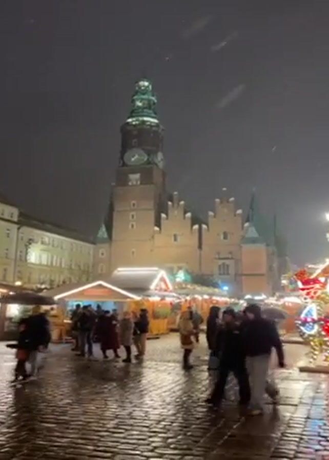 Christmas market scene at night, with light snow falling. Several people are walking around the market, which has wooden stalls with light strings. A tall clock tower is visible in the background, as well as other buildings. An illuminated sleigh is in the foreground. The ground is wet and appears to be made of cobblestone.
