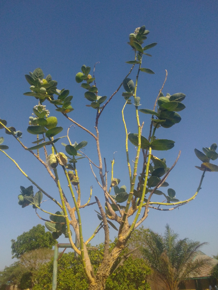 - "The image presents an outdoor scene dominated by a large, multi-stemmed plant, identified as likely a Calotropis species, viewed from a low angle against a clear, brilliant blue sky" by FM-R1vx33, licensed under CC BY 4.0