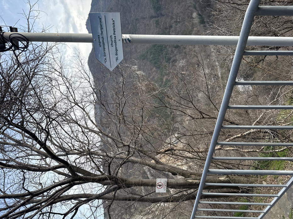 The image depicts a mountain landscape near Asenovgrad, Bulgaria, featuring a directional sign. In the foreground, a gray metal railing composed of a horizontal top bar and vertical balusters runs across the bottom of the frame, suggesting a path or viewing area. A concrete surface is visible beneath the railing on the left. The midground is occupied by several deciduous trees with bare branches, indicating late winter or early spring. A white rectangular warning sign, featuring a red border, a crossed-out symbol of a falling person, and Cyrillic text, is affixed to one of the tree trunks on the left. To the right, a gray utility pole stands. Attached to this pole is an arrow-shaped silver sign pointing left. This sign is bilingual, displaying "Църква "Св. Богородица Петричка"" and "church "St. Bogoroditsa Petricka"", indicating the direction to the Church of St. Bogoroditsa Petrichka, a landmark in Asenovgrad. The background consists of a deep valley with steep slopes and undulating mountains covered primarily by leafless trees and some sparse evergreen patches. A winding road is faintly discernible within the valley. The sky is light blue with scattered white clouds. No individuals are present in the scene.