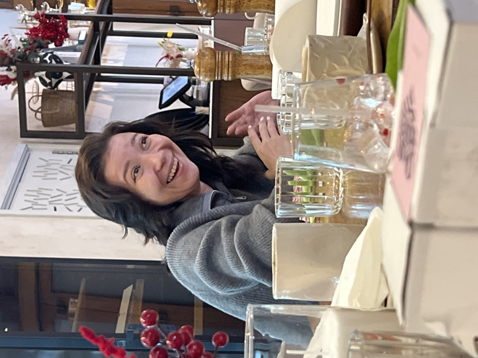 This scene is located in a restaurant or cafe in the city of Pushkin, Russia. The image features a woman with dark, shoulder-length wavy hair, fair skin, and a wide, open-mouthed smile directed toward the right. She is wearing a grey, ribbed, quarter-zip sweater. Her hands are positioned on a light-colored wooden table, with her right hand slightly raised as if in gesture. The foreground of the table includes several clear glasses of various designs (some fluted), light-colored ceramic cups, folded white paper napkins, and a small pink card. A decorative branch with red berries is partially visible on the far left. In the background, a light-colored wall with abstract vertical patterns is visible. A multi-tiered dark metal shelf unit holds items such as a woven basket and floral arrangements featuring red and white elements. A Point-of-Sale (POS) system terminal is discernible on a counter behind the woman's right shoulder. Large wooden salt and pepper grinders are also present on the table to the right. The overall environment suggests an indoor dining establishment.