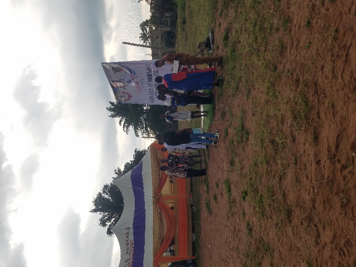 The scene depicts an outdoor gathering on a reddish-brown dirt field with sparse green vegetation in Alor, Nigeria, under an overcast sky. Approximately 10-15 individuals are present. To the left, a large white canopy tent with purple and orange fabric decorations displays "AS MENTALS" on its side. In the center-right, a tall, vertical banner features crests and the text "COLLEGE OF NURSING SCIENCES." Several individuals wear academic regalia, including blue and red gowns, while others are in civilian clothing. One person on the far right wears a light brown uniform-like outfit. The group is gathered near the banner, with some individuals interacting, and one person kneeling on the ground directly in front of the banner. Distant trees and a faint structure are visible in the background.