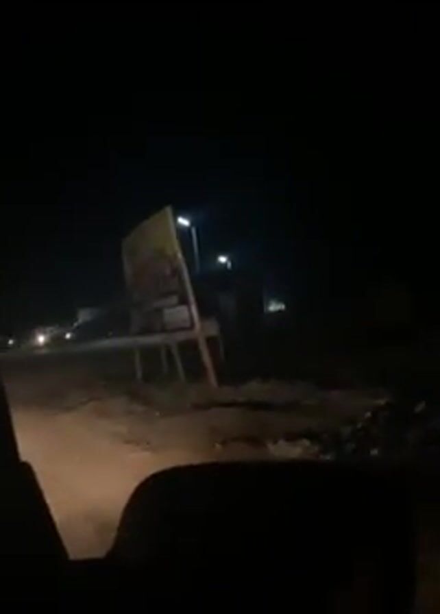 nighttime scene from inside a vehicle, likely a car, moving on a dirt road. The camera points towards the passenger side. Outside, streetlights illuminate the roadside. A large advertising billboard is visible, displaying an image of people and text promoting a "Success for Anniversary" event scheduled for "Sinodo 2025." Further down the road, there's a small, simple building or structure. The video's dark and grainy quality makes identifying specifics challenging. A child's voice is heard in the background.