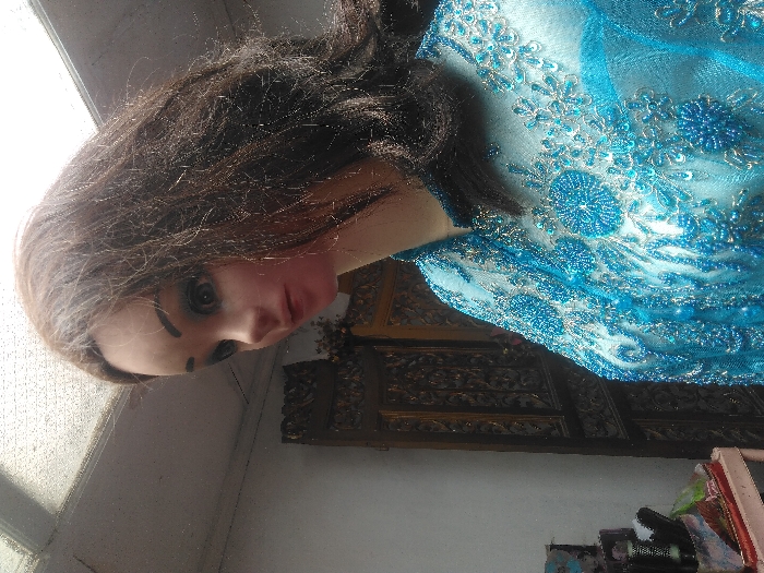 The image displays a female mannequin positioned in an indoor setting within Almaty, Kazakhstan. The mannequin is presented from the chest up, angled slightly left and facing right with a downward gaze. It has light brown, wavy hair extending over its shoulders, a pale complexion, dark eye makeup, and light pink lips. The mannequin wears a high-collared, long-sleeved garment crafted from a sheer, light blue fabric, densely decorated with intricate floral and abstract patterns using blue beads and silver embroidery/sequins. In the background, a light-colored wall is visible on the left, alongside the edge of a light-toned table or shelf holding various indistinct, colorful objects. To the right, a dark, intricately carved wooden door or room divider is present. The ceiling above features a prominent rectangular skylight, providing bright, natural light to the scene.