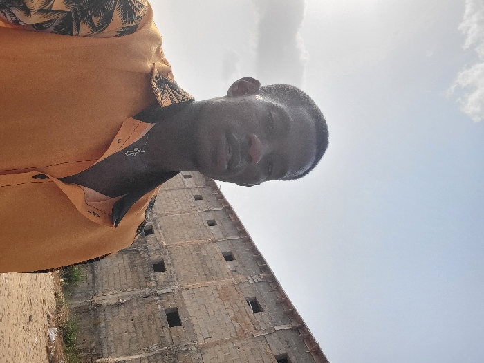 A man wearing a yellow shirt with black trim is pictured against a partly cloudy sky and a building. The man looks down and slightly to the right. The building behind him appears to be unfinished, constructed from grey blocks with visible window openings and no glass. The ground is a sandy color. The sun seems to be above, causing a bright, somewhat washed-out appearance in the sky.