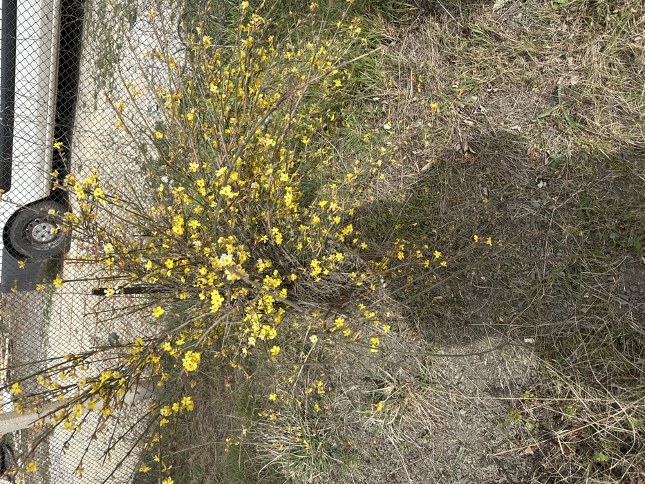 The scene, set in the city of Chorul, Bulgaria, depicts an outdoor area on a clear day. A large, deciduous bush with numerous small, bright yellow flowers blooming on its bare branches occupies the central foreground. The ground immediately surrounding the bush is composed of dry, matted brown grass, interspersed with patches of green vegetation and exposed soil. In the background, a chain-link fence runs horizontally, behind which a white vehicle, likely a van, is partially visible, displaying its side profile and a black wheel with a silver hubcap. The area is illuminated by natural daylight, casting subtle shadows on the ground. No individuals or specific activities are present within the frame.