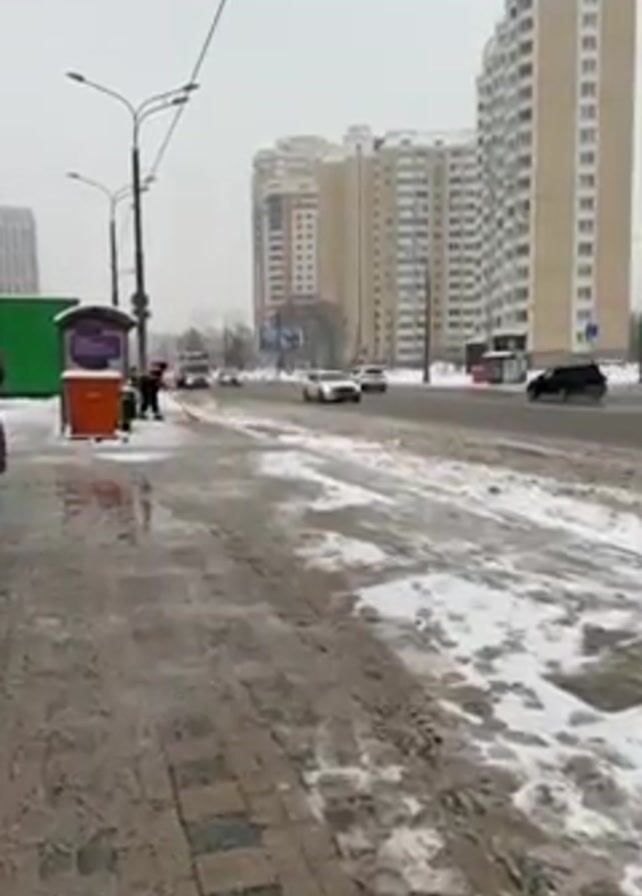 The video captures a street scene in an urban environment during winter. The sidewalk is covered in a mixture of slush and dirty snow, showing tire tracks. There are a few people standing near a bus stop, which features an orange trash can. The street is partially covered in snow and slush, with multiple cars driving along it. In the background, several tall apartment buildings are visible under an overcast sky.