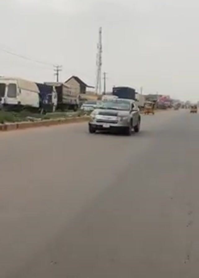gray road with a scattering of vehicles in the distance and several parked alongside the road. Most notably, small yellow "keke" auto-rickshaws are seen traveling on the road. There is a grassy area alongside the road with parked trucks and containers. Utility poles and a tall cell tower rise up in the background. The sky is overcast. The camera view is from a vehicle traveling on the road.
