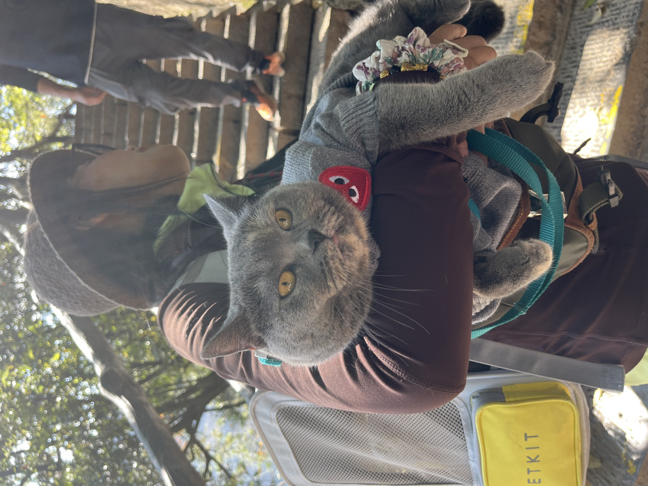 A gray cat with golden eyes is being held by a person. The cat wears a gray sweater with a red heart emblem and a floral scrunchie around its paw. The person wears a brown shirt and a knit hat. A backpack with teal straps is visible. A yellow and white bag with the word "PETKIT" is situated below the cat. The setting appears to be outdoors, with a glimpse of stairs and trees.
