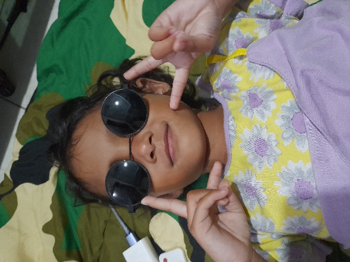 A young girl is depicted lying on a camouflage-patterned sheet or blanket in Gelam, Indonesia. She is wearing round, dark-lensed sunglasses that obscure her eyes, and a yellow long-sleeved shirt patterned with white and purple flowers, overlaid by a plain purple garment. Her dark hair is disheveled around her head. Both of her hands are raised, positioned near her head, with the index and middle fingers extended to form a 'V' shape, indicative of a peace sign. Her mouth is closed with a slight upward curve. To the upper left of the subject's head, a white USB power adapter is visible with a grey cable connected, alongside a small, partially visible red object.