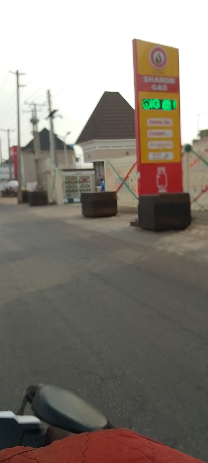 A blurry image shows a Sharon Gas station. The digital display reads "BIG GAS". The station has a yellow and red sign. There are several gray barriers in front of the station. A road is visible in the foreground, along with part of a vehicle (presumably a motorcycle) and an orange piece of clothing. Power lines are visible in the background. The image is slightly out of focus.