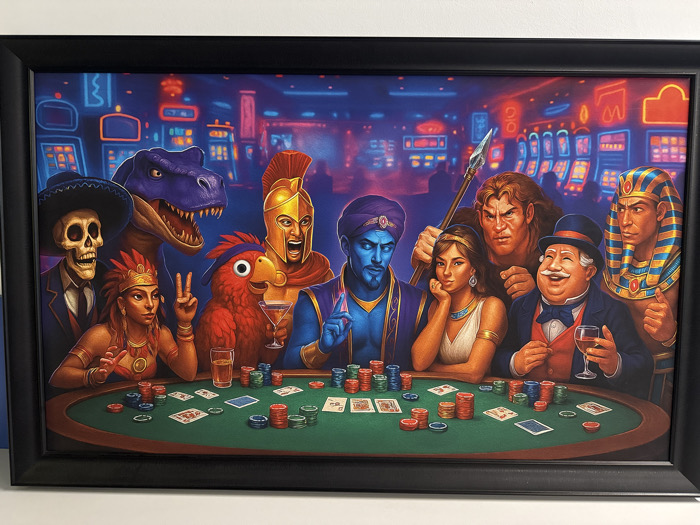 - "A horizontally oriented, framed artwork is depicted, featuring ten diverse fictional characters engaged in a poker game around a green oval table within a neon-lit casino environment" by FM-91Fwq1, licensed under CC BY 4.0