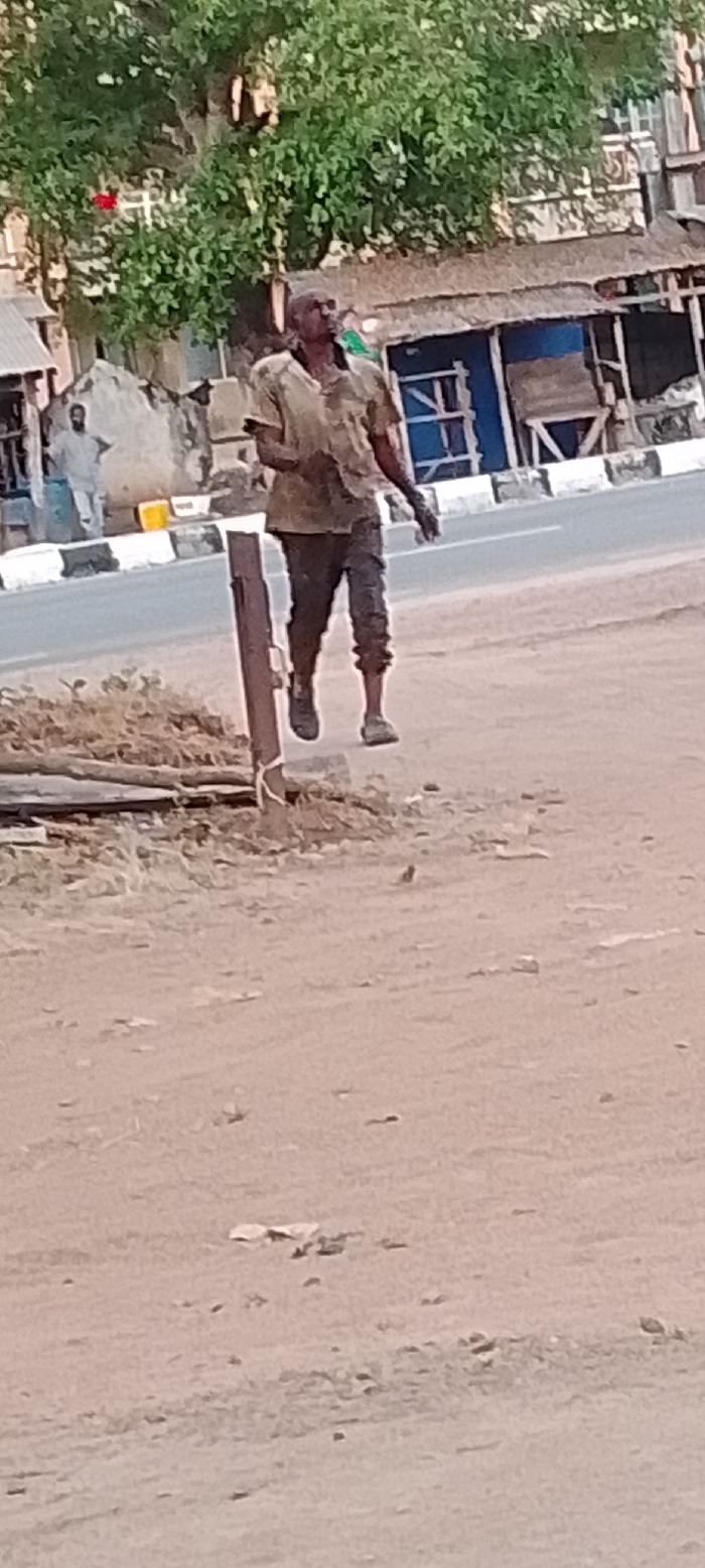 The image portrays an outdoor street-level scene in Adankolo, Nigeria. The foreground consists of reddish-brown dirt or sand with scattered debris. A dark, possibly wooden or metal, post stands vertically in the left-mid foreground, with a white strap or material wrapped around its lower section. In the midground, an adult male is captured in motion, walking from left to right across the dirt path. He is bald or has a closely shaven head, wears a light-colored, short-sleeved shirt, dark pants, and mismatched footwear (a dark shoe on his right foot and a lighter sandal-like shoe on his left foot). His head is tilted slightly upwards, and his gaze is directed towards the upper right. Behind him, a paved road with a white and black striped curb runs horizontally across the scene. To the left, behind the curb, a second adult male with a beard and light-colored clothing stands near a building, observing to his left. Yellow containers are visible near the road's edge on the left. The background features various urban structures. Immediately behind the road, several small buildings or stalls with corrugated metal roofs are visible. A distinctive blue structure with white framework is situated to the right. Further back, light-colored buildings are partially obscured by dense green foliage from large trees that dominate the upper background. A small red object is visible within the tree foliage on the upper left.