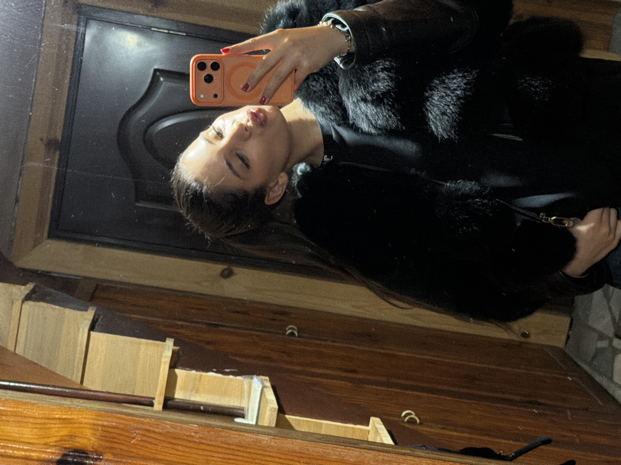 A woman is taking a selfie in a mirror. She is wearing a black jacket with a fur collar. The mirror reflects a black door. The background includes a wooden surface with trim. The location is unknown and cannot be determined based on the visual data.