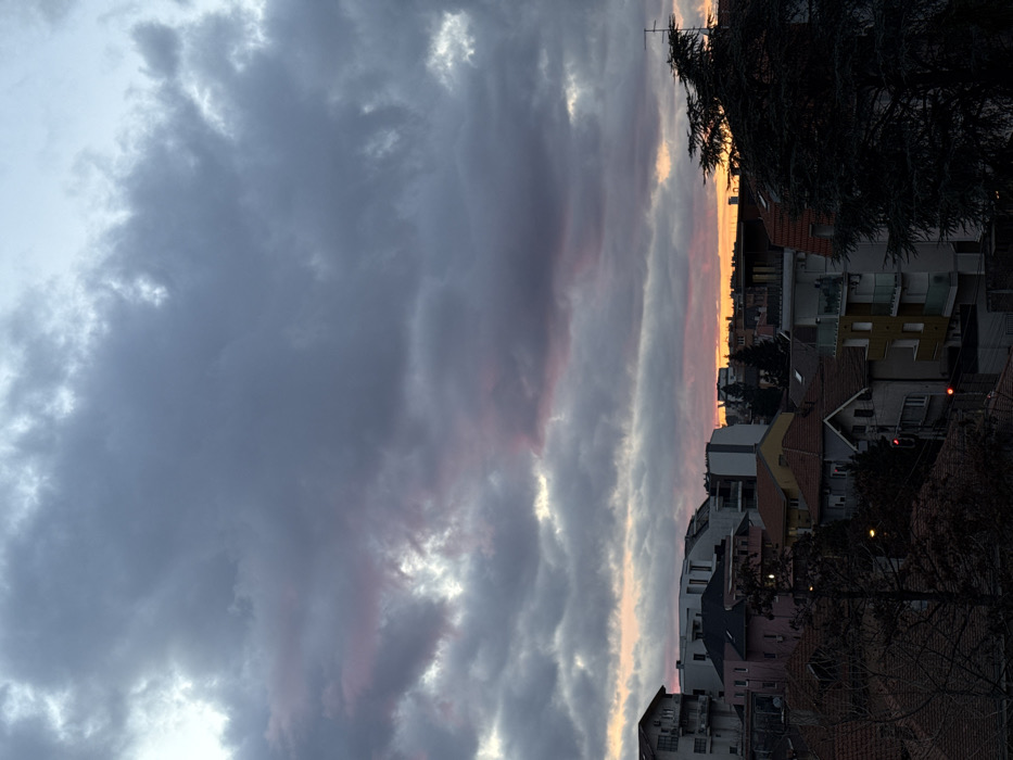 A cityscape stretches horizontally across the frame's right half, dominated by buildings with varying rooftops and styles. Above, a sky filled with dense, gray clouds occupies the majority of the image. Hints of pink and orange light streak through gaps in the cloud cover, suggesting either sunrise or sunset. Tree branches obscure portions of the buildings, adding depth.