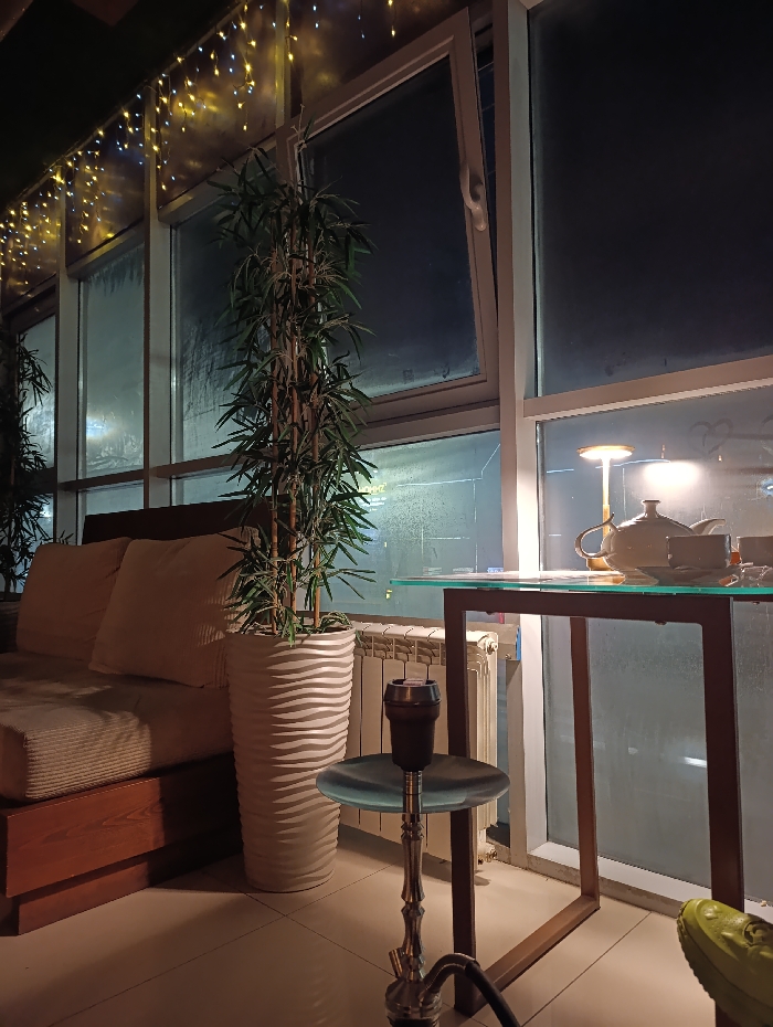The image displays an indoor scene at night, presumably in Rostov-on-Don, Russia. A light-colored, upholstered couch with a wooden base and two back cushions occupies the left side of the frame. Centrally, a tall, artificial plant with bamboo-like stalks stands in a white, wave-textured planter. Above, string lights displaying warm yellow and cool white tones are strung across the top of the window frames. The background is dominated by large, multi-pane windows. One window panel, second from the left, is slightly tilted open. The exterior view is dark, with condensation or raindrops visible on the glass, suggesting an outside environment at night. A white radiator is visible beneath the window, between the plant and a table. On the right, a small, square glass-top table with a dark metal frame holds an illuminated table lamp with a brass-colored base and a white shade. A white teapot and at least two white teacups are arranged on the table. In the immediate foreground, a silver-toned hookah with a dark bowl and a light blue glass tray stands on the floor. A dark hose extends from the hookah, partially visible at the bottom right. The toe of a bright lime green shoe is visible in the bottom right corner of the frame. No individuals are fully depicted.