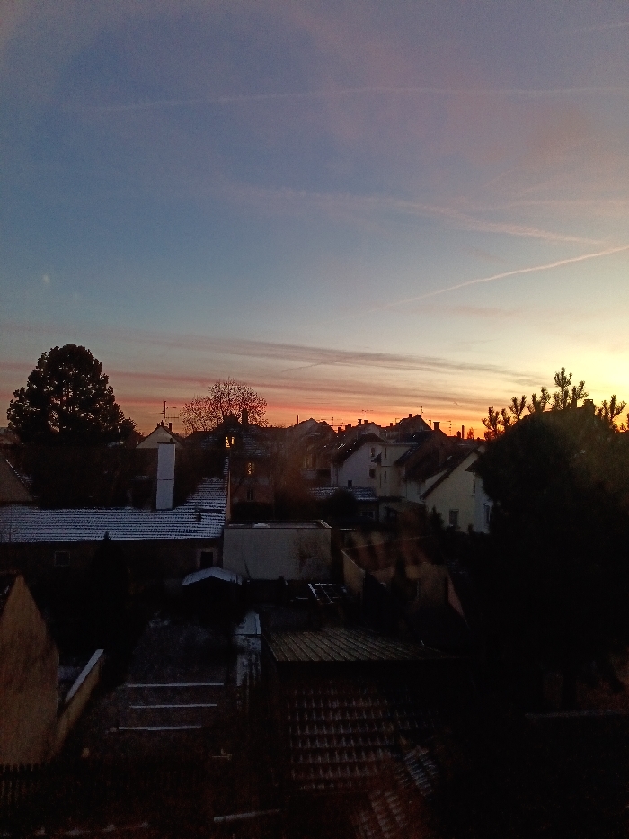 An elevated, wide-angle photograph depicts a residential neighborhood in Unknown, Unknown, at either sunrise or sunset. The sky, occupying the upper two-thirds of the frame, transitions from a deep blue at the zenith to a gradient of light blue, purple, and orange-pink along the horizon. Multiple faint, white contrails are visible across the sky. The mid-ground reveals a dense cluster of detached and semi-detached houses with tiled roofs, many exhibiting a light covering of snow or frost. Prominent objects include a tall white chimney on a building towards the left, and various television antennas on rooftops. One window in a central house is illuminated, emitting a warm yellow light. Silhouettes of bare deciduous trees are interspersed among the buildings, with a large, dark deciduous tree on the far left and a dark coniferous tree partially visible on the far right. The immediate foreground is largely obscured by dark rooftops, building structures, and steps covered in shadow, consistent with the elevated perspective looking down into a yard or alleyway. No individuals or specific actions are discernible. The environment indicates a cold climate, likely winter, due to the presence of snow/frost on roofs.