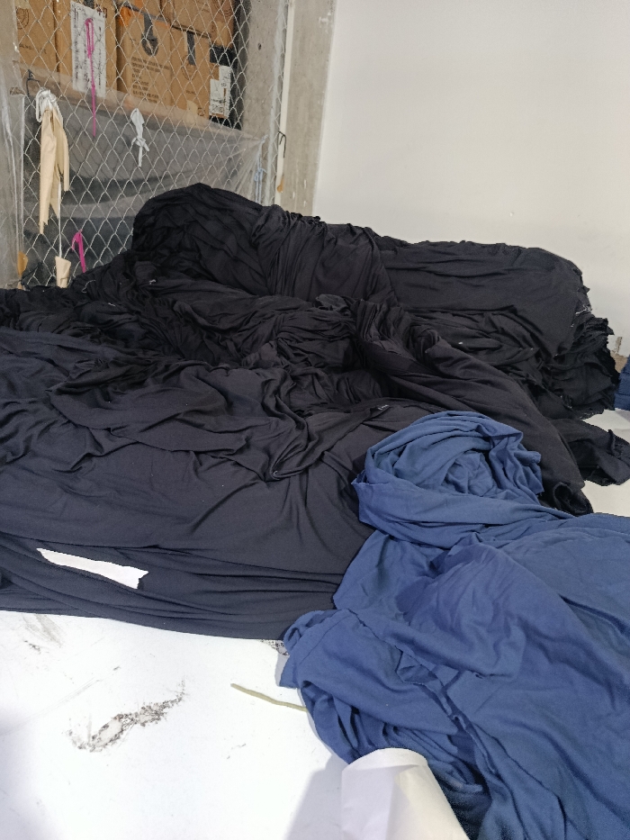 The image depicts an indoor scene in the city of Ate, Peru, characterized by large quantities of textile material