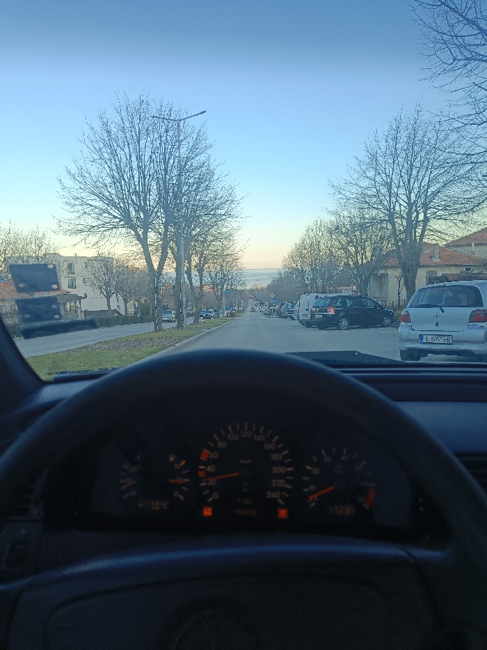 The image depicts a street scene in Byala, Bulgaria, viewed from the interior of a stationary or slowly moving vehicle
