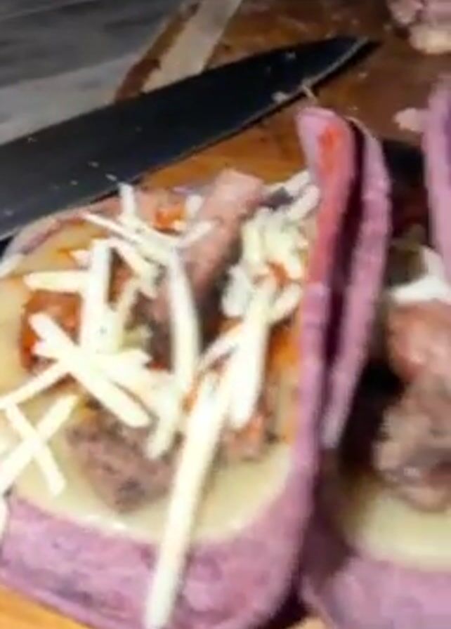 Here is a detailed description of the video. The video shows a wooden cutting board with tacos and sandwiches on it. The tacos have purple shells and are filled with cheese and meat. The sandwiches appear to be burger patties between slices of bread. A person's hand is seen putting the top piece of bread on a sandwich. The scene is dimly lit, possibly outdoors at night. A black knife is on the board, along with a bottle of hot sauce. A water bottle is visible in the background.