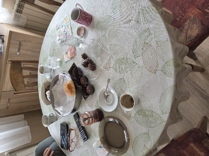 A round table, covered with a white tablecloth featuring green and brown leaf patterns, is depicted in an indoor setting within Cherkovitsa, Bulgaria. The table is laden with various items suggesting a recent or ongoing casual meal. On the table, from left to right, a partially visible individual's forearm and hand rest on the tablecloth. A black smartphone and a pair of red-framed eyeglasses are positioned near a black remote control. A glass jar containing reddish jam or preserves with a spoon inserted is present. Next to it, a white espresso cup with visible brown residue sits empty. A white saucer with a small spoon rests beside a smoked glass plate. Further clockwise, a silver metallic bowl holds a single light-brown pastry on a white paper napkin. An empty white mug with brown residue and an almost empty white espresso cup on a saucer are visible. A clear, ridged glass object stands near two Euro banknotes (one 10 Euro, one 20 Euro) and a colorful paper item (possibly a child's drawing or craft). A clear drinking glass is positioned near a small pink saucer containing a small amount of liquid or residue, and a pink mug with "love you" text. A black plastic tray with four compartments, one containing a chocolate candy, and a clear plastic container holding five chocolate truffles are also on the table. In the background, wooden cabinetry with two doors is visible, along with a wooden chair. A white radiator is situated to the right, and sheer white curtains are present on the left. The floor appears to be light-colored wood or laminate.