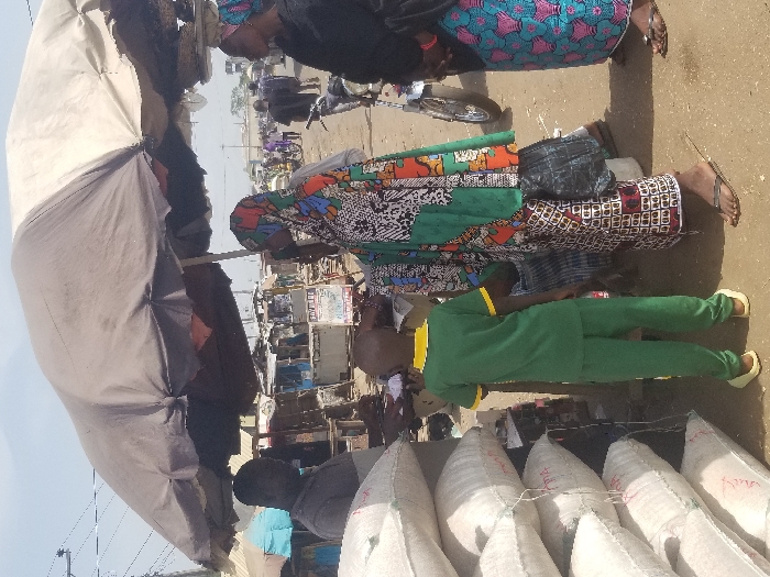 The image depicts an active outdoor market scene in Lokoja, Nigeria, under a bright, hazy sky