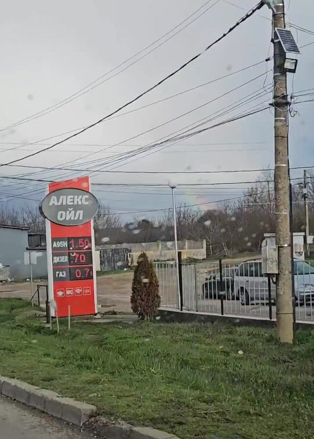 driver's view of a road and gas station on a cloudy day. The car is stopped in front of an "АЛЕКС ОИЛ" gas station, and the price signs show the prices of different types of fuel. The road is wet and there are other vehicles parked nearby. There are power lines and utility poles visible. The video begins with the camera pointed towards a gas station sign. The video then shows the road ahead through the windshield of a car. There appears to be a rainbow in the distance. A few people are visible on the side of the road.