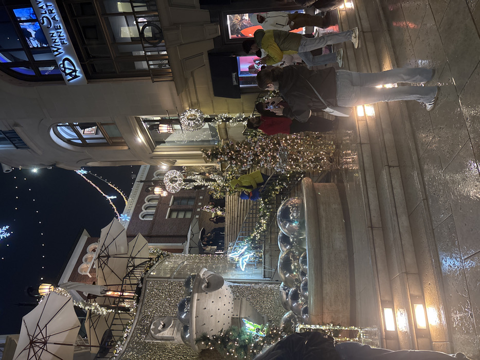 An outdoor scene at night depicts a decorated urban space with a fountain and buildings illuminated by lights and holiday decorations. People are present, looking at their phones. Retail establishments, including one advertising "Wynn Slavy Fine Art", are visible. The architecture includes brick buildings and white tents. The ground appears wet, reflecting the ambient light.