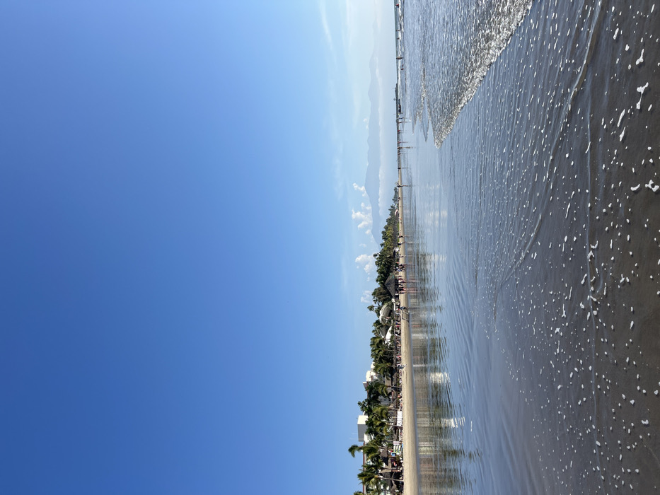 A beach scene under a clear, bright blue sky. The shore is lined with palm trees and buildings. A long pier extends into the water. Gentle waves with white foam roll onto the sandy beach. Mountains are visible in the distance, partially obscured by clouds. The water reflects the sky and surrounding environment, creating a mirrored effect on the wet sand.