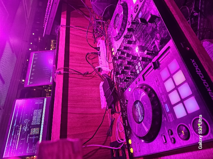 - "The scene depicts a DJ setup within an indoor venue, heavily illuminated by purple and magenta lighting" by FM-xETiK2, licensed under CC BY 4.0